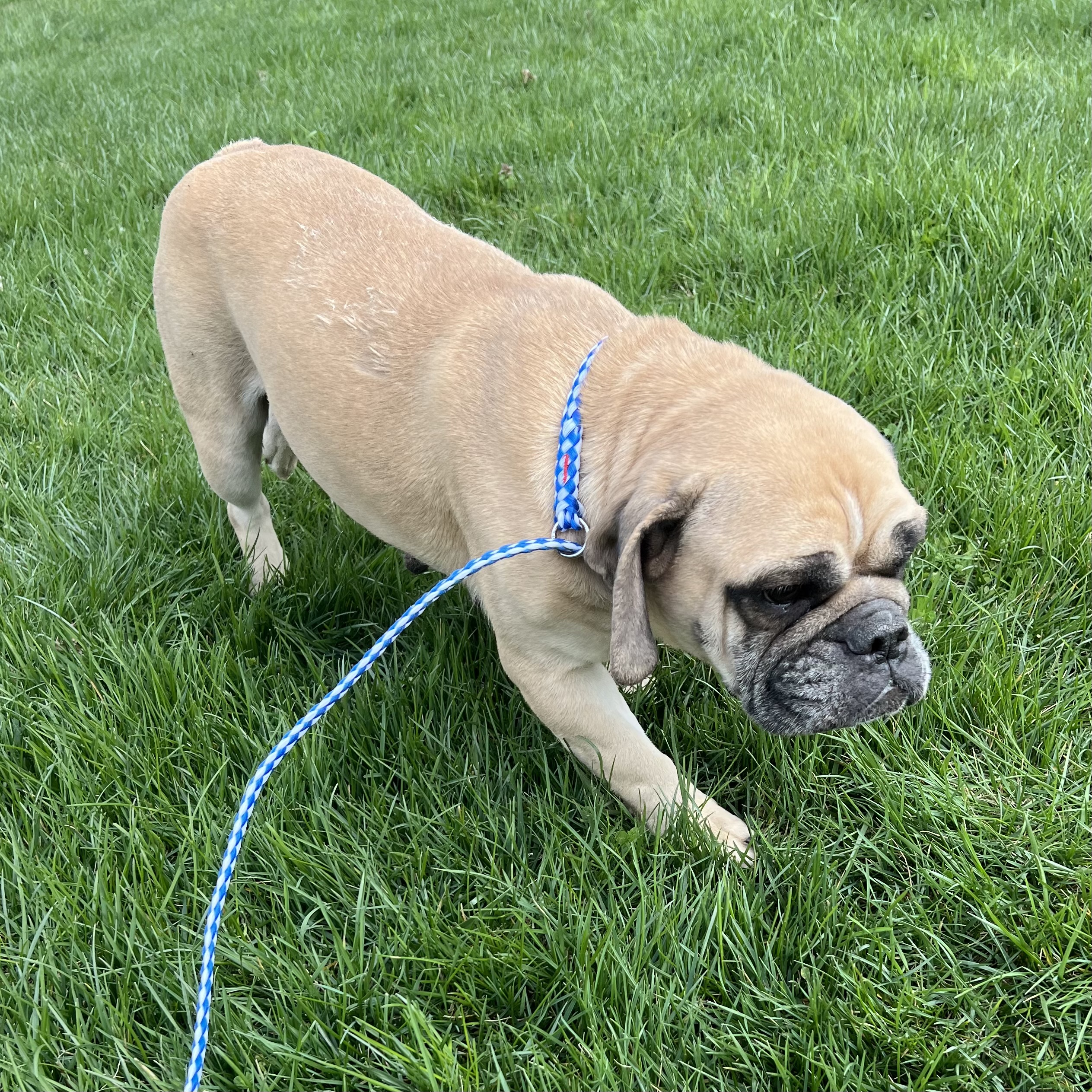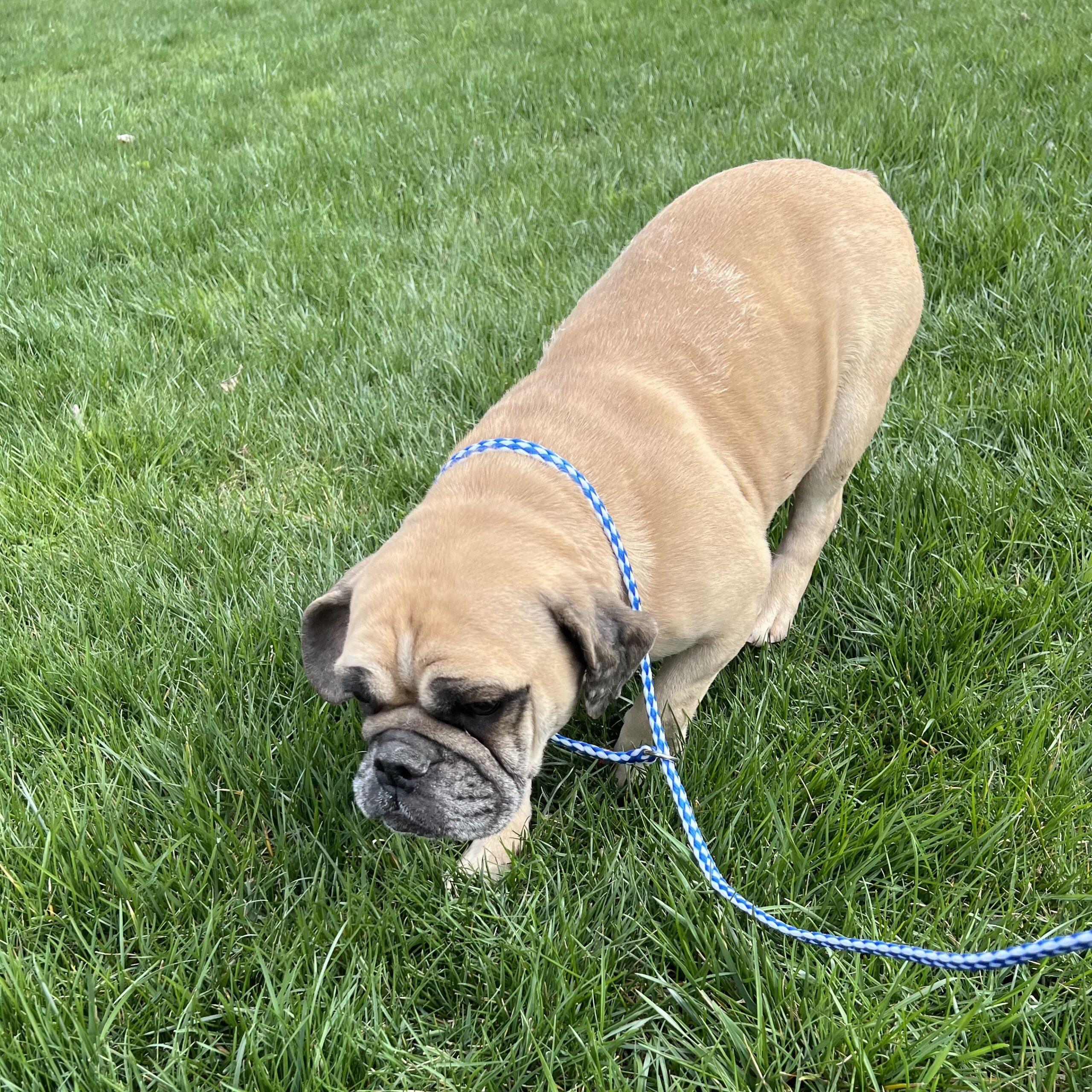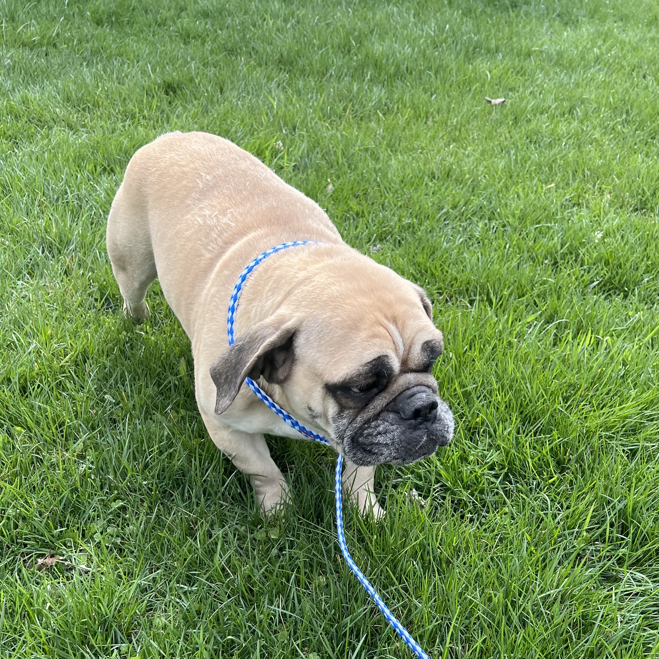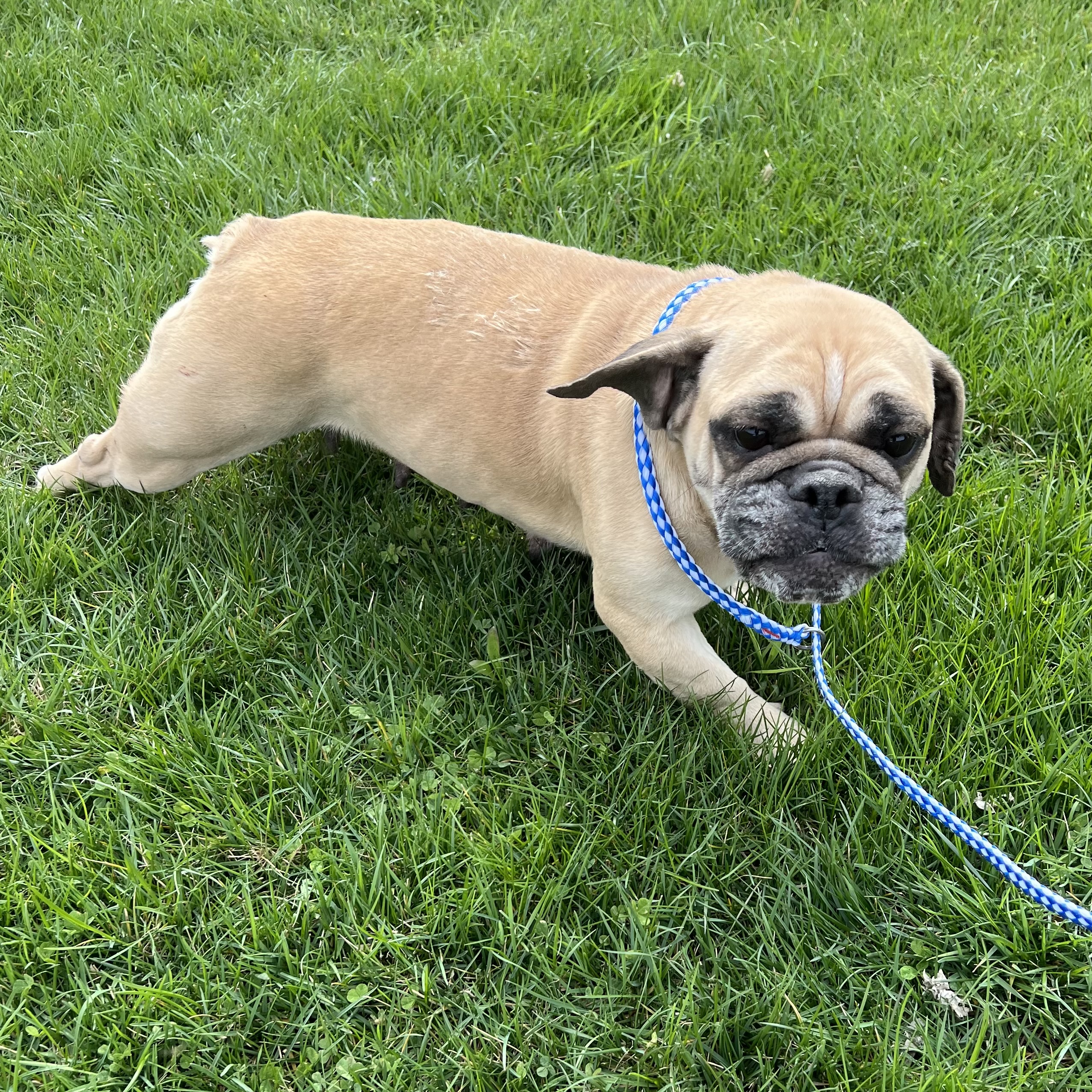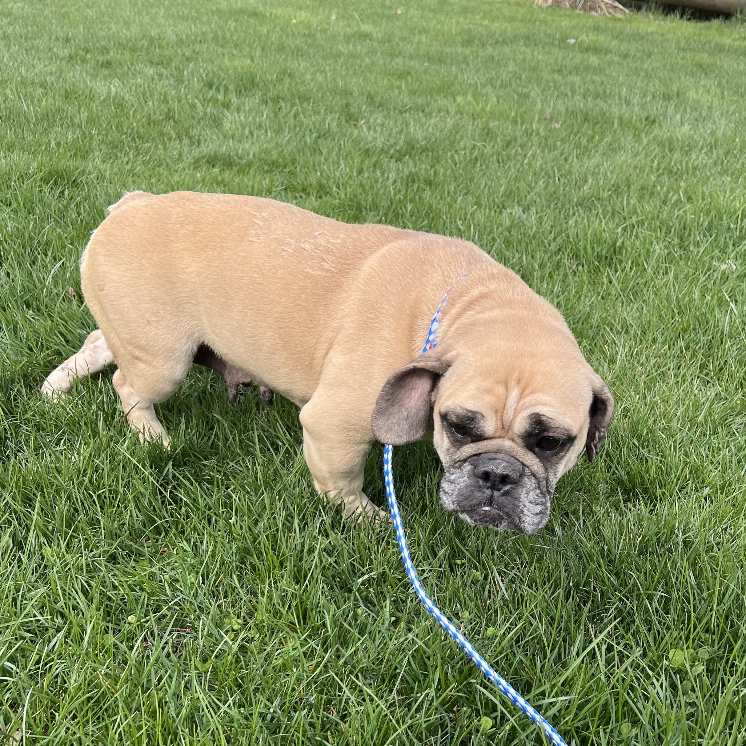 Maggie is a retired breeding dog. She is a Mini Bulldog which is a mix of English Bulldog and Pug. She may look like a grumpy old lady but she is anything but. She has a bubbly personality and is always so excited to see you. She loves to run around and play with her other doggie friends. She really enjoys being around her  humans and will almost knock you over with excitement. She is like any other Bulldog and she will shed and she will not be good for you if you have allergies to dogs. She has been spayed and had a dental done. She is microchipped and current on her shots and rabies and is on ProHeart. She is not house trained and will need all training. If you would like to add this bubbly gal to your family please fill out our adoption application.